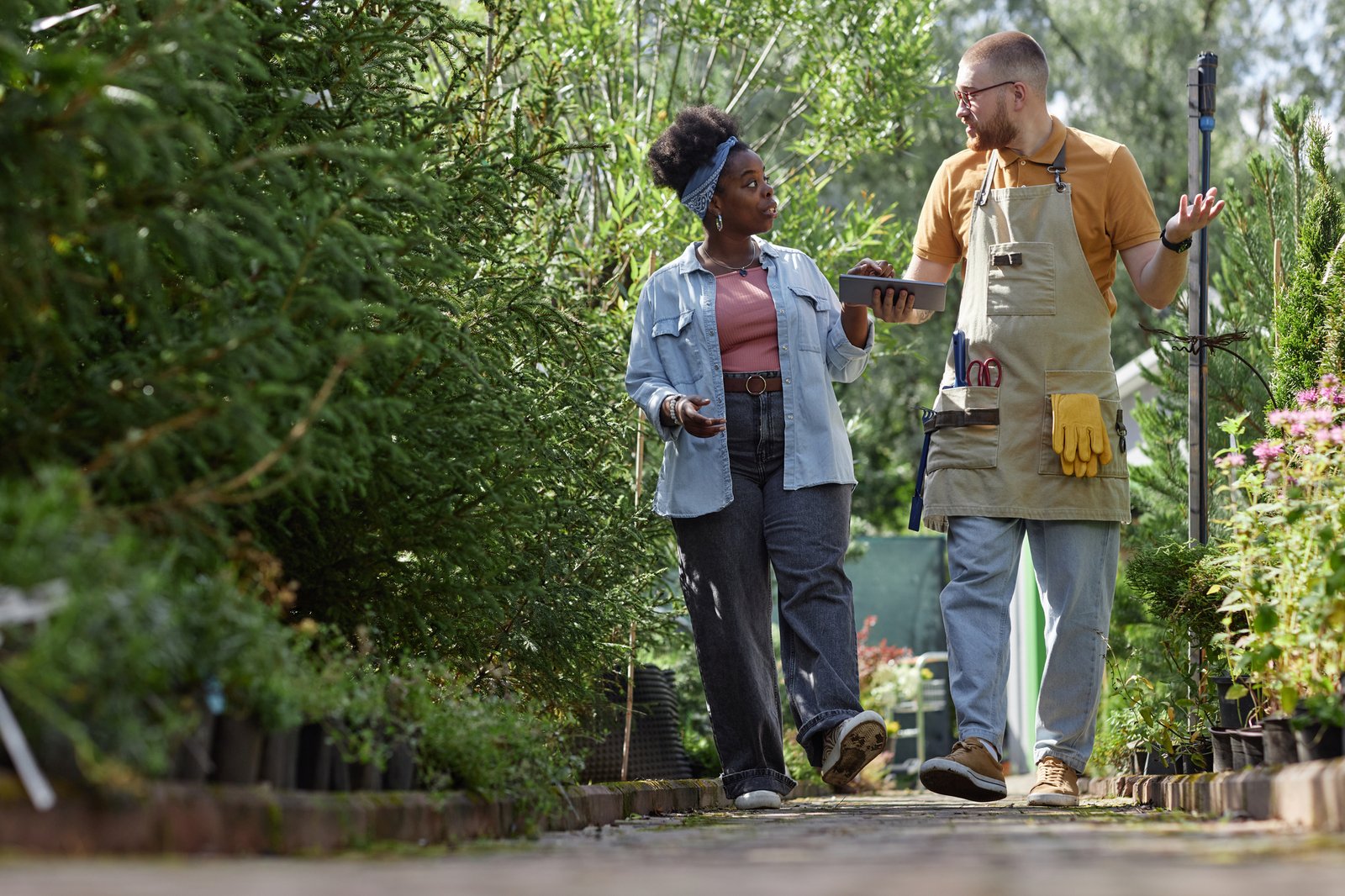 Positive African American female landscape designer using mobile phone while discussing with male client garden project providing man with professional assistance captured against lively greenery